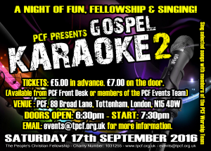 GOSPEL KARAOKE 2 Saturday 17th September Following on from the successful Karaoke event earlier this year, PCF is now bringing you part 2!